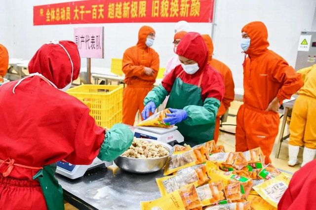 比賽分為兩個項目:小酥肉原料肉切肉比賽和小酥肉包裝比賽。公司屠宰車間、分割車間、調(diào)理品車間、副產(chǎn)車間和熟食車間共派出6支參賽隊伍。小酥肉原料肉切肉比賽每個隊伍時間限定20分鐘,在20分鐘內(nèi)根據(jù)所切肉條的重量和完成質(zhì)量評定名次。鍋圈小酥肉包裝比賽每個隊伍包裝300袋(約80kg)小酥肉,根據(jù)所用時間和包裝合格率評定。比賽開始之前,熟食廠經(jīng)理張沛宣布了比賽的規(guī)則,叮囑參賽選手在比賽中注意安全,隨后比賽拉開了帷幕。